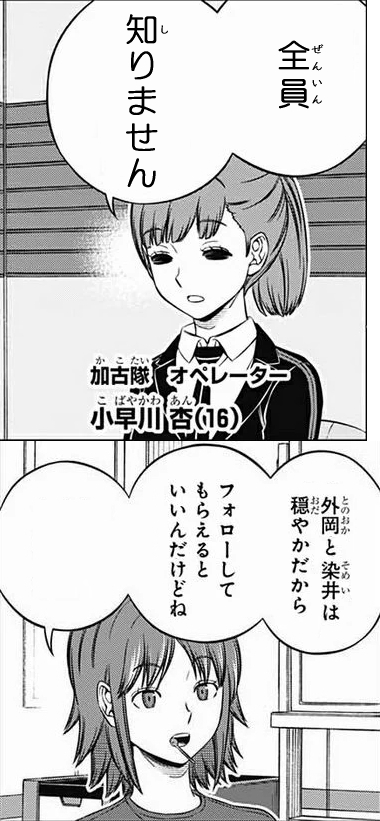 古寺(南沢/頭のいい陽キャ)・六田・奥寺・三浦(巴/ヨーコちゃんが可愛くて入隊)・木虎(辻/男子が苦手だがモテたい)