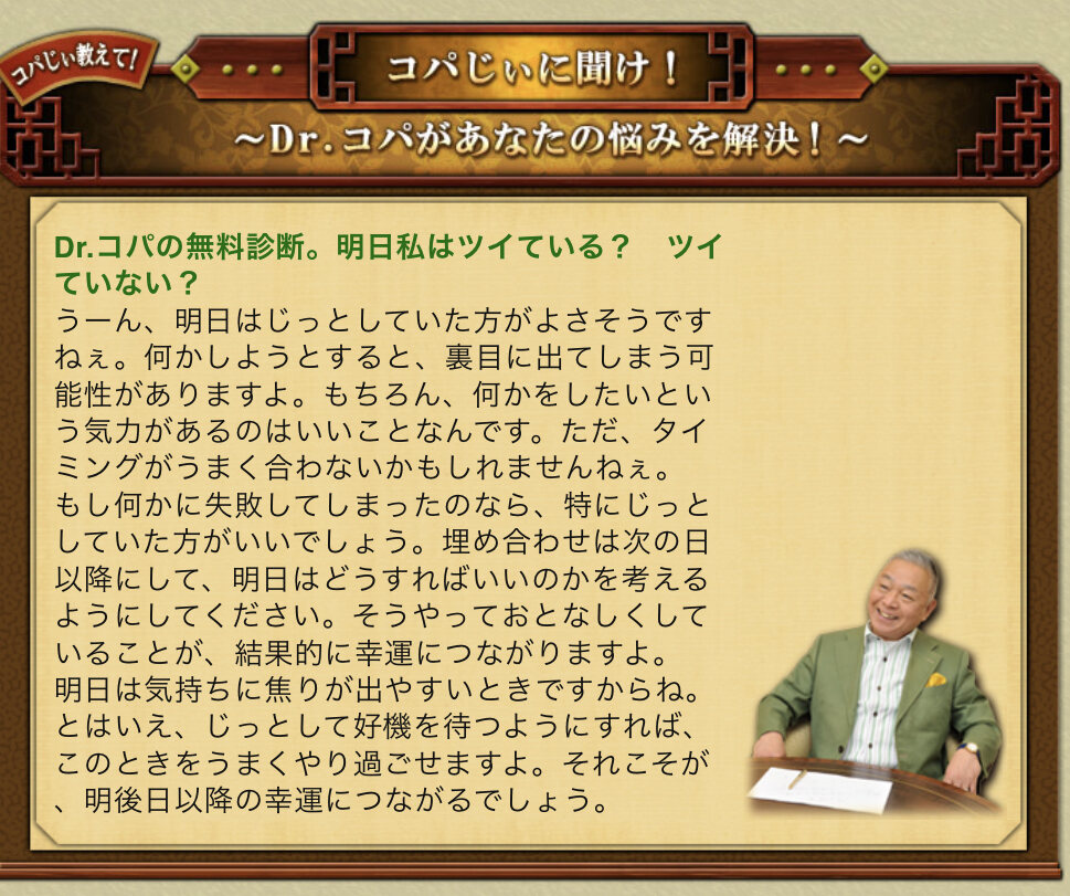 なまえだけで驚愕的中!【陽気な幸運オヤジDr.コパ】開運姓名判断 - Dr.コパの無料診断。明日私はツイている? ツイていない?cc-fortune.jp - 31二次元好きの匿名さん22/08/19(金) 13:40:04