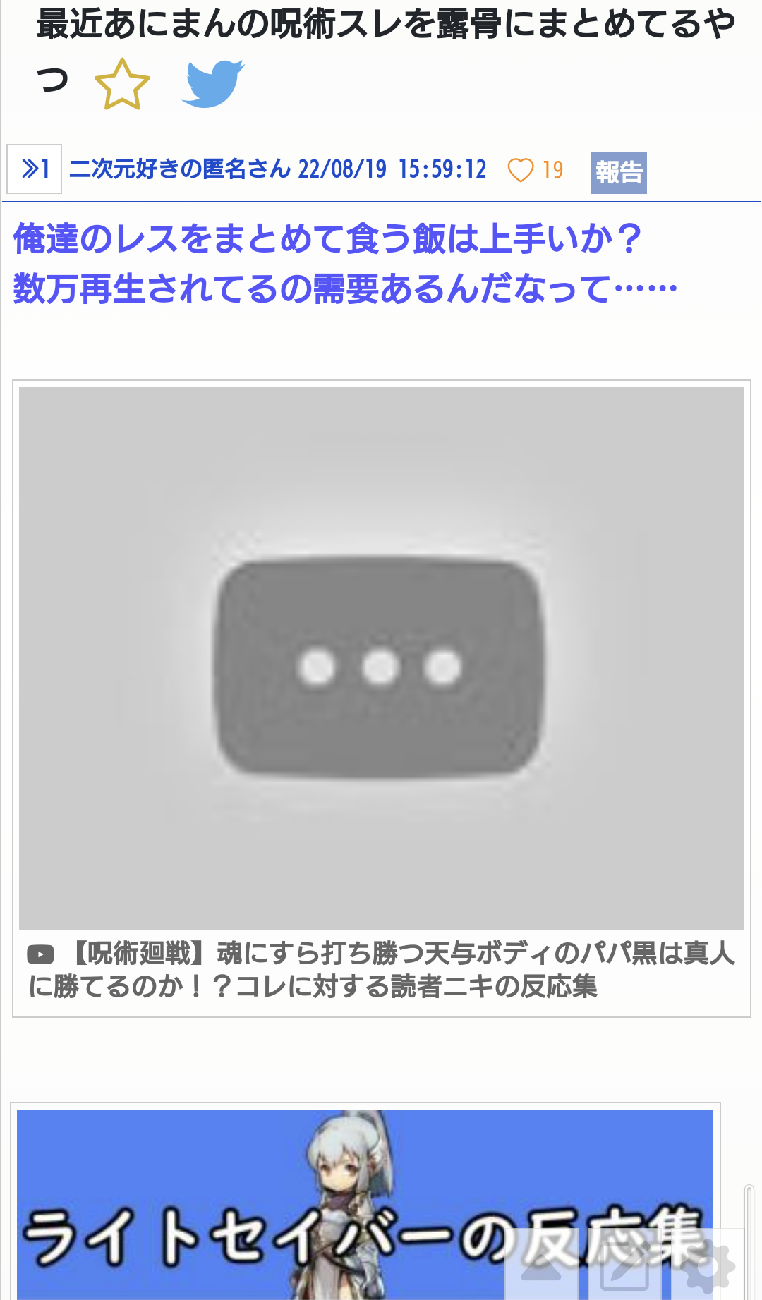 最近あにまんの呪術スレを露骨にまとめてるやつ|あにまん掲示板俺達のレスをまとめて食う飯は上手いか?数万再生されてるの需要あるんだなって……https://youtu.be/EydGi72QgY4https://youtu.be/u3hjnpuTio4bbs.animanch.com香ばしい人(名前を呼んではいけないあの人、■■■■■■本人)も書き込んでた