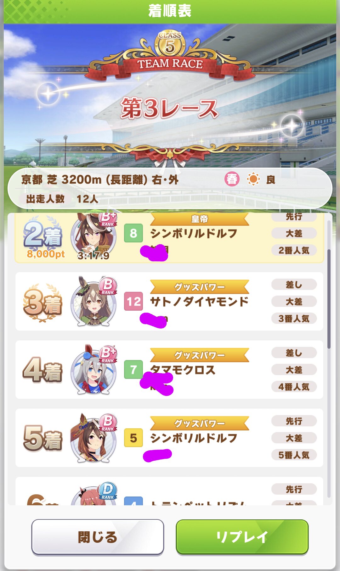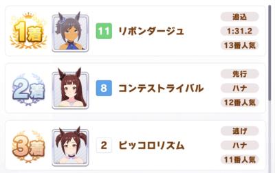 1二次元好きの匿名さん22/08/20(土) 11:18:58報告育成で万馬券が出そうな低人気大波乱の展開になった着順表を貼るスレコレは単勝と三連単が激しく荒れそうなやつ2二次元好きの匿名さん22/08/20(土) 11:20:28報告こういうのか>>3>>43二次元好きの匿名さん22/08/20(土) 11:21:40報告>>2クレイジー・イン・ラブなんてモブウマ娘いたのか…4二次元好きの匿名さん22/08/20(土) 11:23:34報告>>2ルドルフから総流しで大勝利だったな5二次元好きの匿名さん22/08/20(土) 11:24:02報告別の意味で荒れそう6二次元好きの匿名さん22/08/20(土) 11:31:572報告ふむ