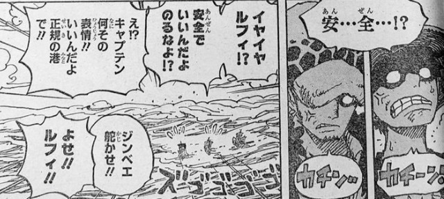 「なんだお前ら、能力使って着水したんか。まあ、俺たちのサニー号はアダムで出来てるからお前ら格下の船じゃしょうがないか」