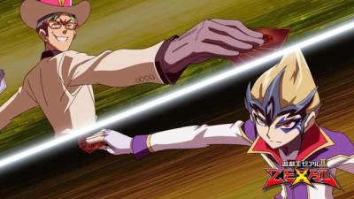 この回のS・H・Dark Knightの活躍っぷりもデュエルの評価ポイントだと思う。主要キャラの新エースは決着シーンで活躍させる構成が多いのに対して、このデュエルの中盤からずっと活躍してる。効果も相手モンスターの素材化なんてランクアップ前まで前代未聞な上、ランクアップしたら素材を使わないで行う。ランクアップ演出もネーミングもカッコいい。七皇の剣含めて当時にしては正直盛りすぎだったけど、Ⅳもそれに初見で拮抗するし、今までとランクが一段階上なデュエルだと思う。