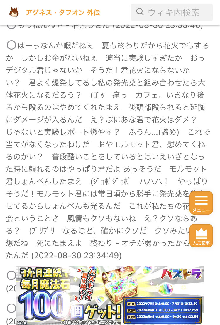 wikiのコメ欄に書かれるとスクロールが面倒ってだけでこっちに書き込む分には何でも良いですよ。
